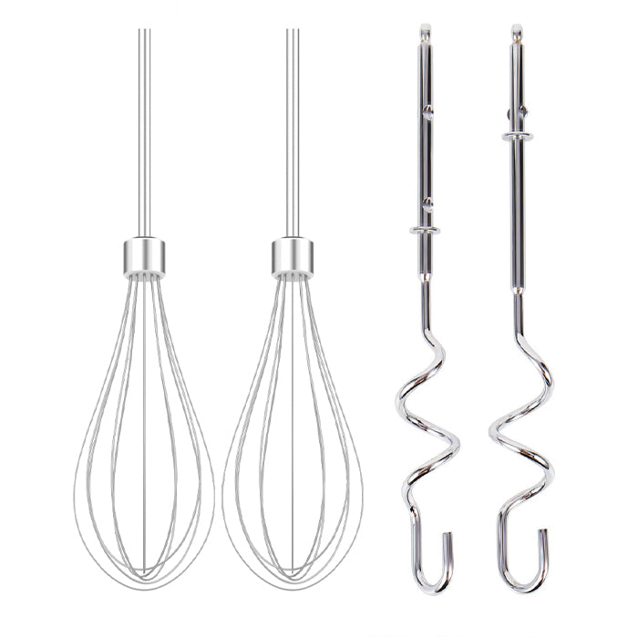 6 accessoires variables : 2 fouets + 2 Bateurs en Inox +2 crochets pétrisseurs