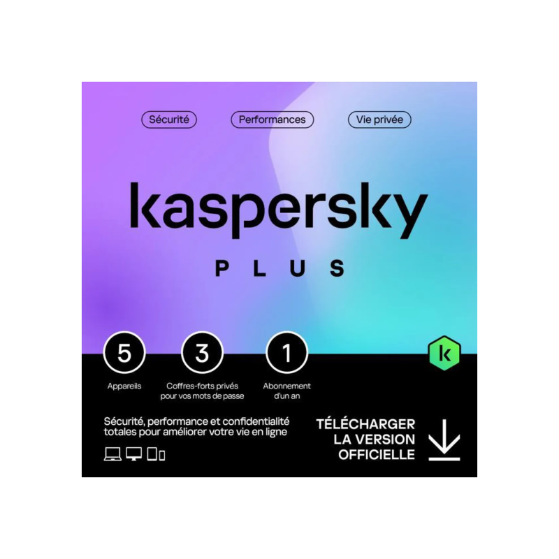 Kaspersky Plus est une solution de sécurité complète conçue pour protéger jusqu’à 5 appareils (PC, Mac, smartphones) pendant 1 an. Elle offre une protection avancée contre les virus, ransomwares, spywares, et autres menaces en ligne. Ce produit inclut des fonctionnalités de sécurité Internet, telles que la protection des transactions bancaires, un VPN intégré, et le contrôle parental.