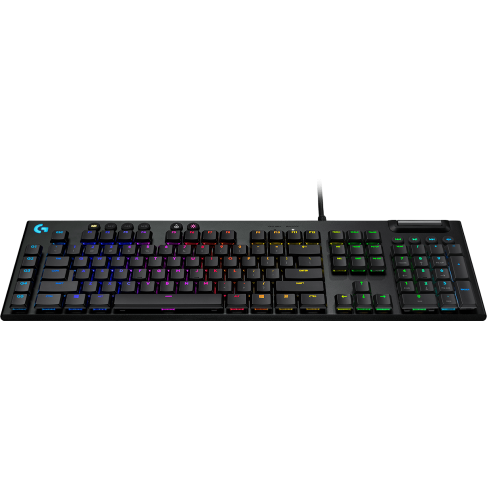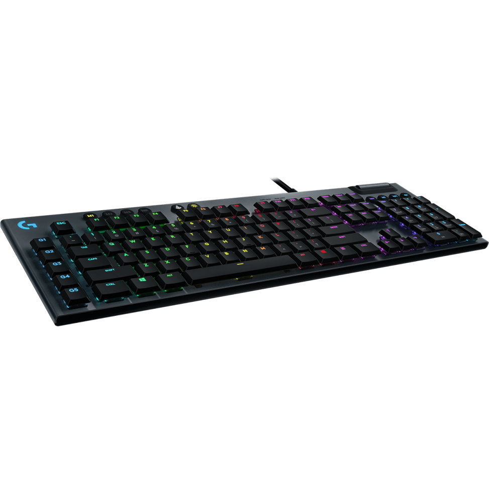 Le Logitech G815 allie performance et finesse dans un design raffiné. Équipé de switches GL Tactile pour une frappe réactive et silencieuse, ce clavier offre un contrôle total grâce à ses touches macro programmables, son rétroéclairage LIGHTSYNC RGB personnalisable et sa molette de volume dédiée. Sa construction en aluminium le rend à la fois robuste et élégant – idéal pour les gamers exigeants.