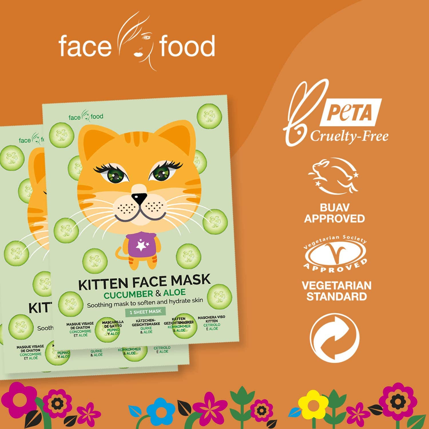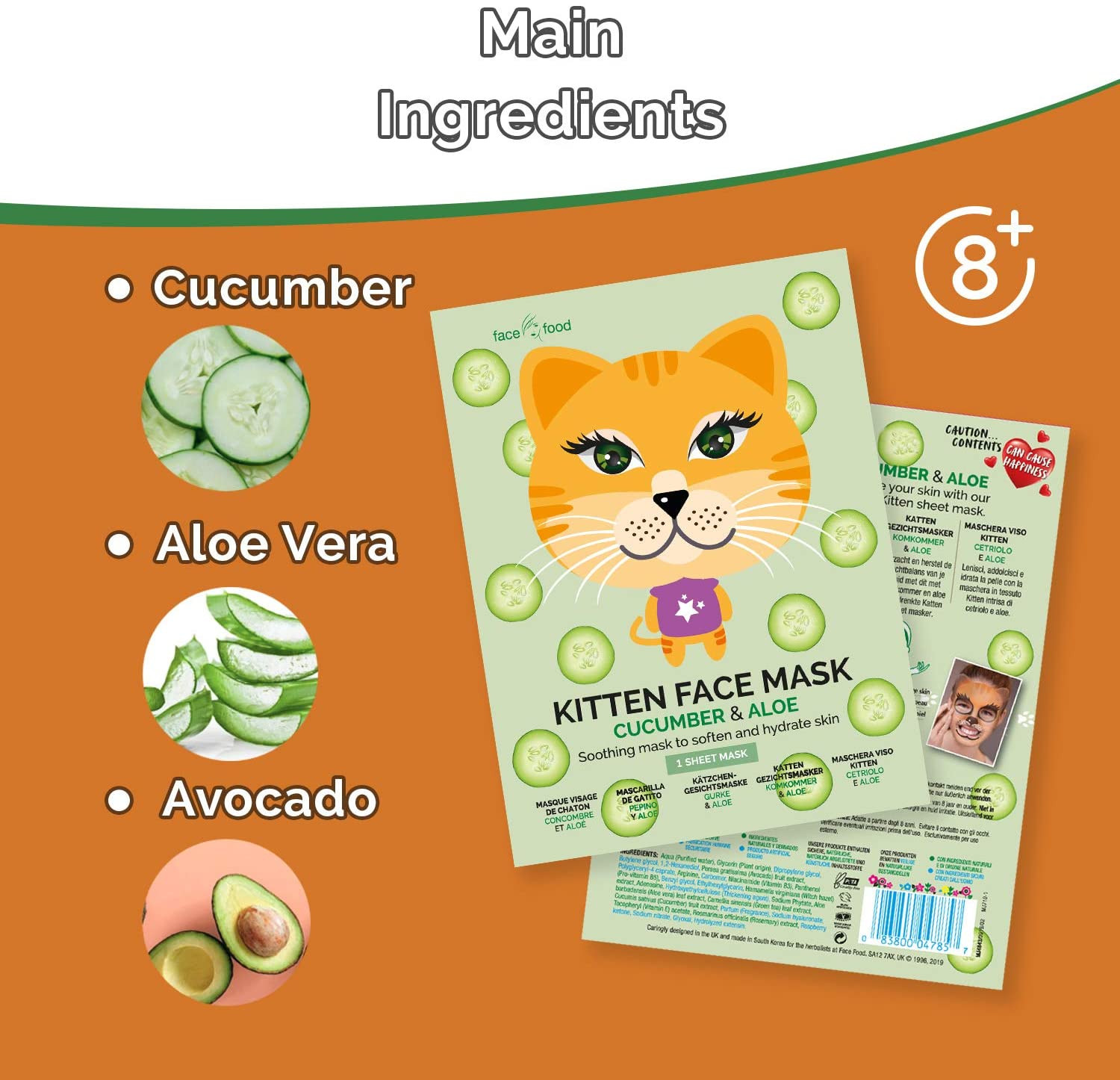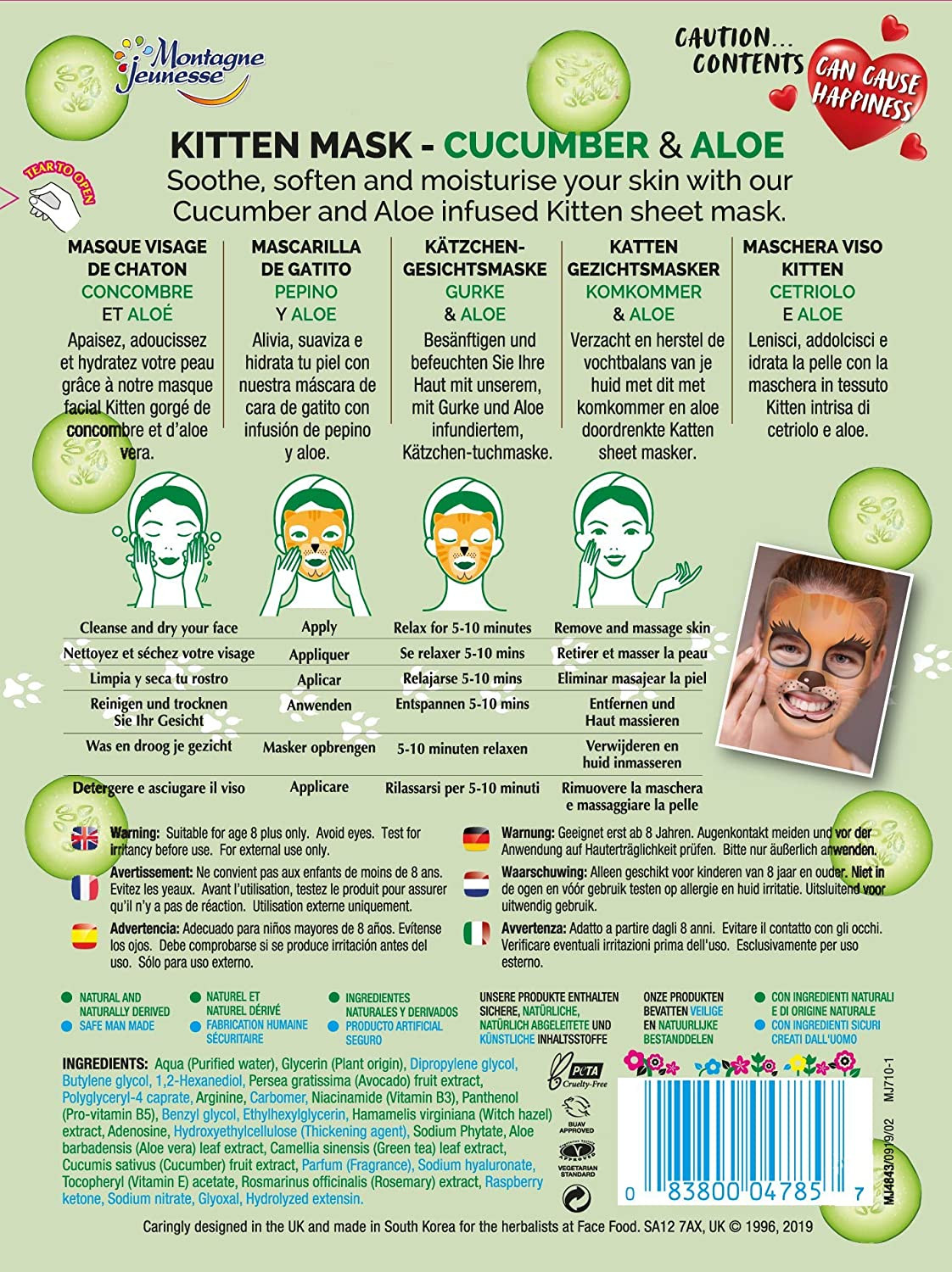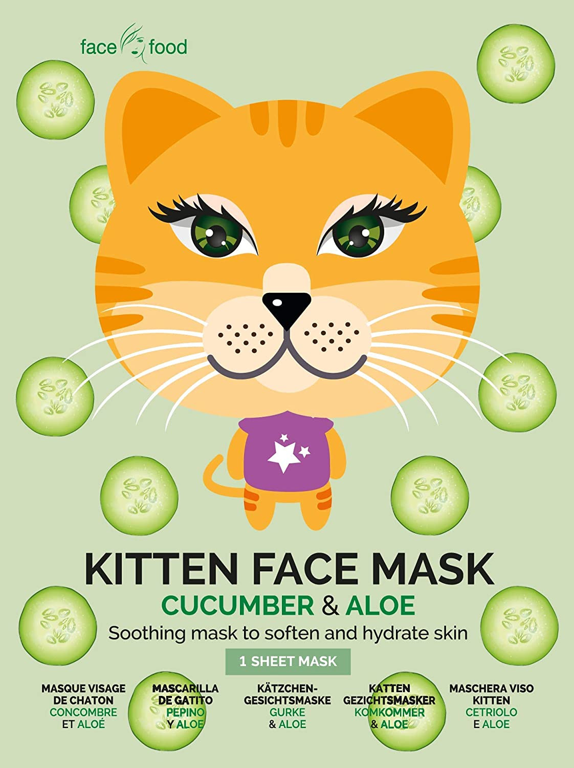 Apaisez et rafraîchissez votre peau avec le masque visage tissu Kitten Concombre & Aloe Vera de 7th Heaven.