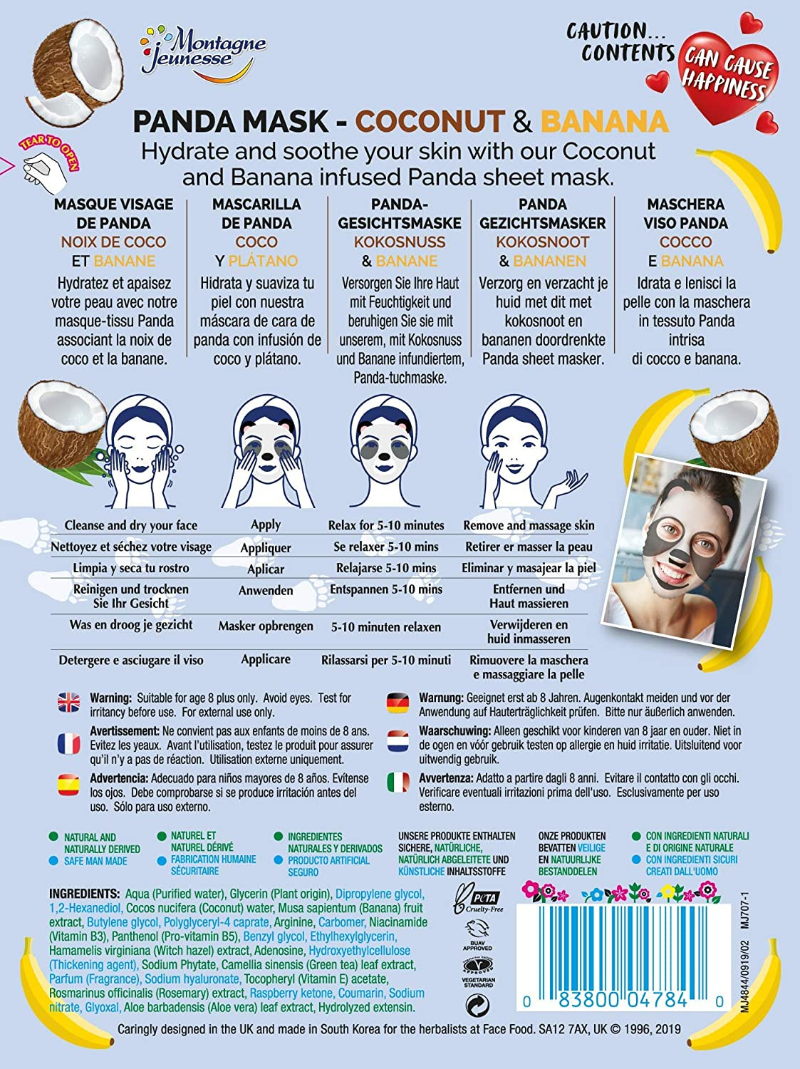 Faites plaisir à votre peau tout en vous amusant avec le masque visage tissu Panda à la noix de coco et à la banane de 7th Heaven.