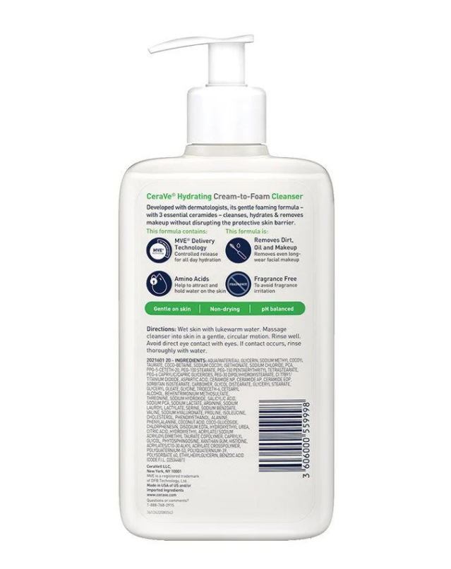 Le Nettoyant Crème-Mousse Hydratant CeraVe nettoie et hydrate la peau en un seul geste. Sa texture crémeuse qui se transforme en mousse douce élimine les impuretés, le maquillage et l'excès de sébum tout en respectant la barrière cutanée naturelle. Formulé avec 3 céramides essentiels, acide hyaluronique et acides aminés, il est idéal pour les peaux normales à sèches.