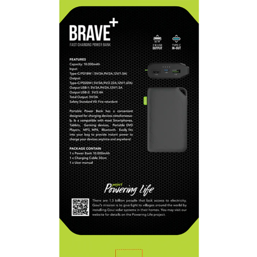 Le PowerBank Goui Brave Plus est une batterie externe compacte et puissante avec une capacité de 10 000 mAh. Elle offre une charge rapide jusqu'à 20W pour recharger efficacement vos smartphones, tablettes et autres appareils compatibles. Dotée de plusieurs ports, cette batterie portable est idéale pour les déplacements quotidiens.