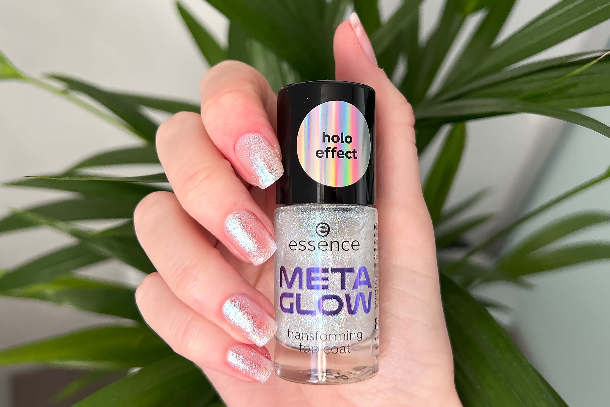 Le Top Coat Meta Glow Transforming d’Essence transforme n’importe quel vernis en lui apportant un effet métallisé holographique. Il crée une brillance futuriste avec des reflets multidimensionnels, inspirés du style "metaverse". Idéal pour donner un look original et éclatant aux ongles.